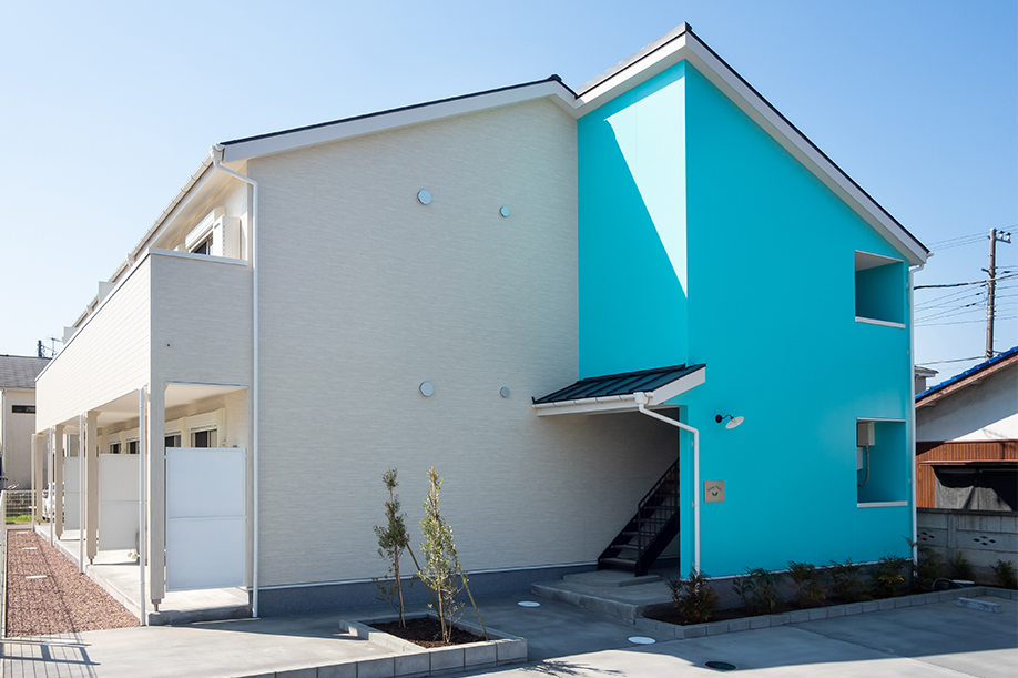 ブルーの外壁が