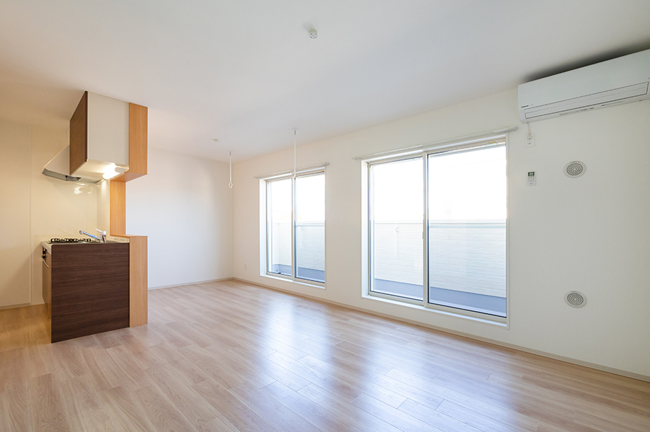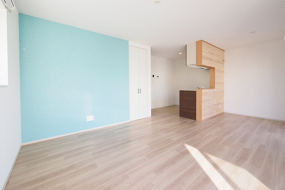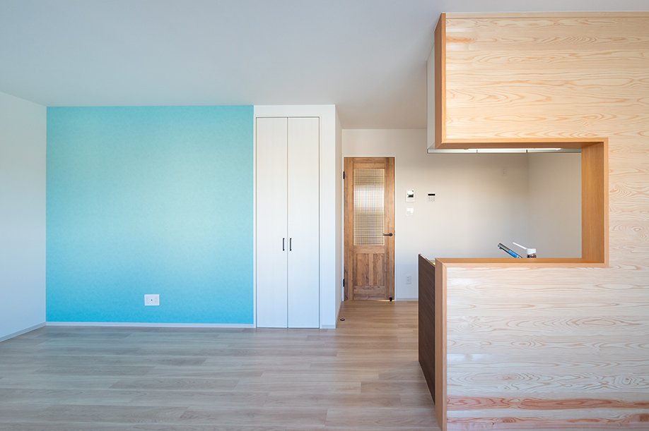 外壁に合わせブルーのアクセントクロスに