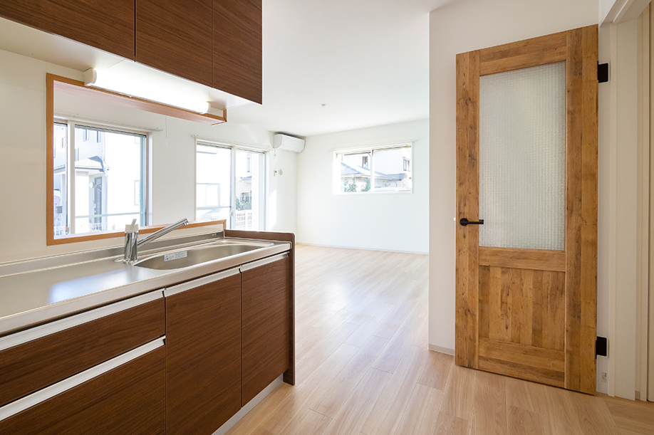 木のキッチンカウンターで爽やかな