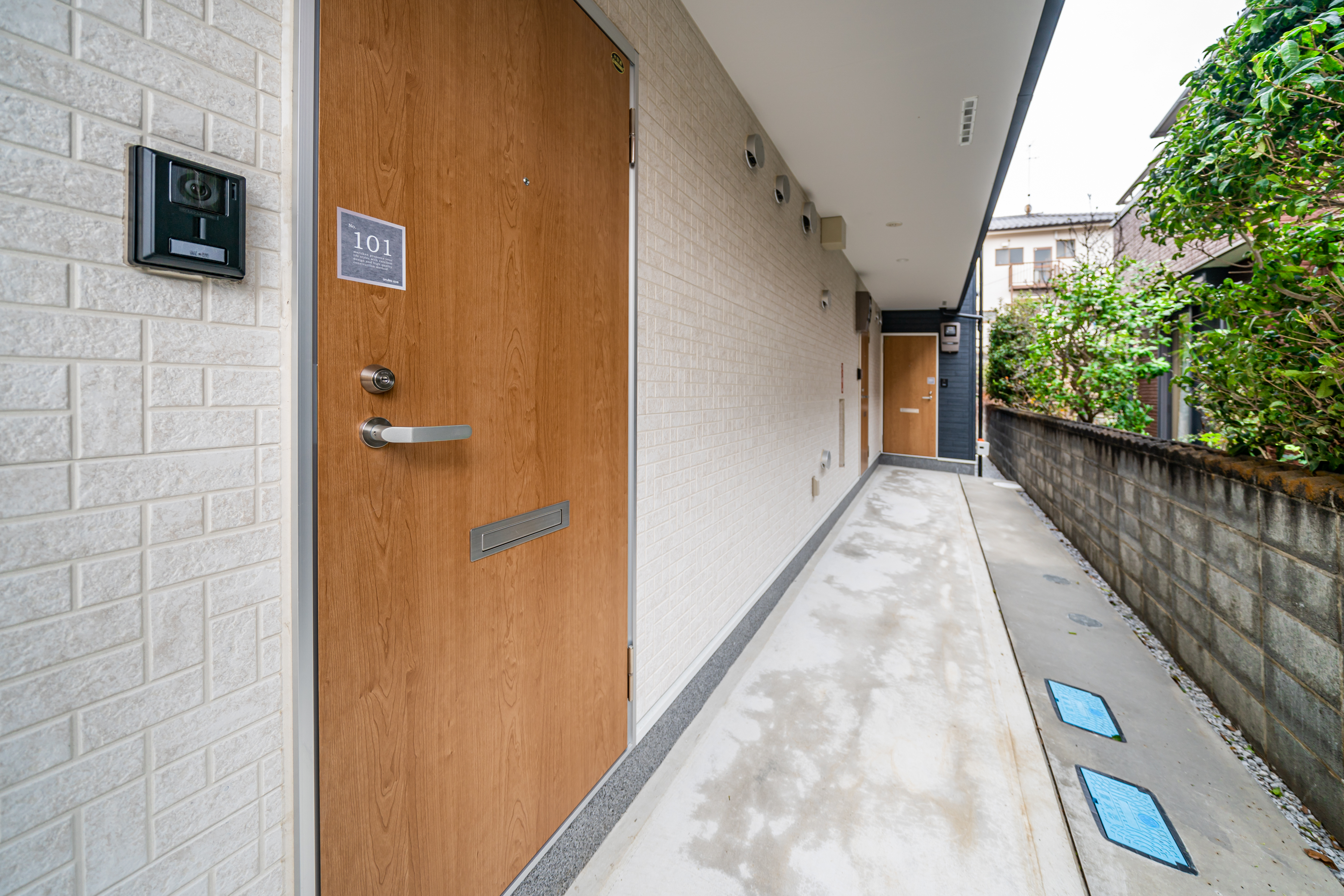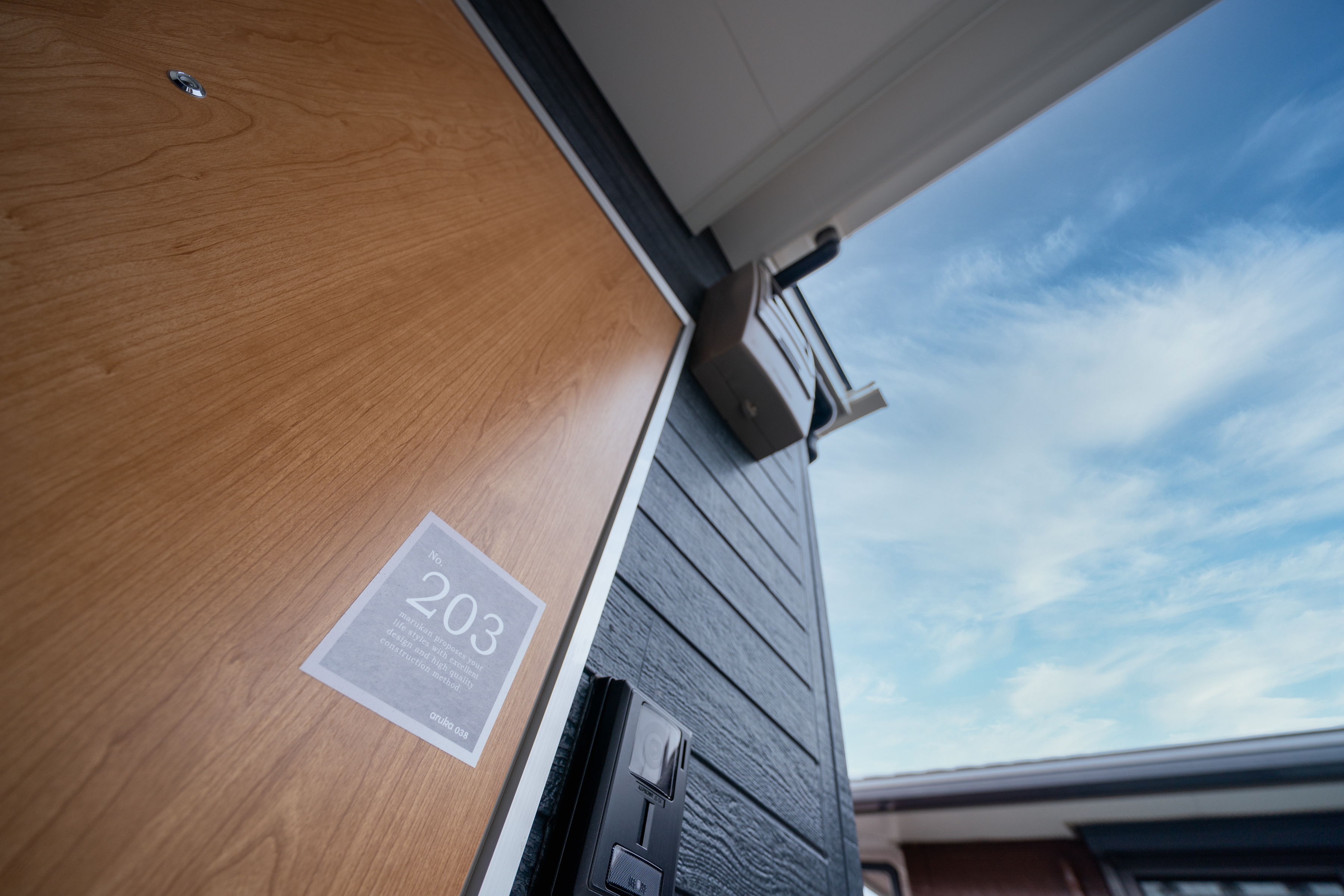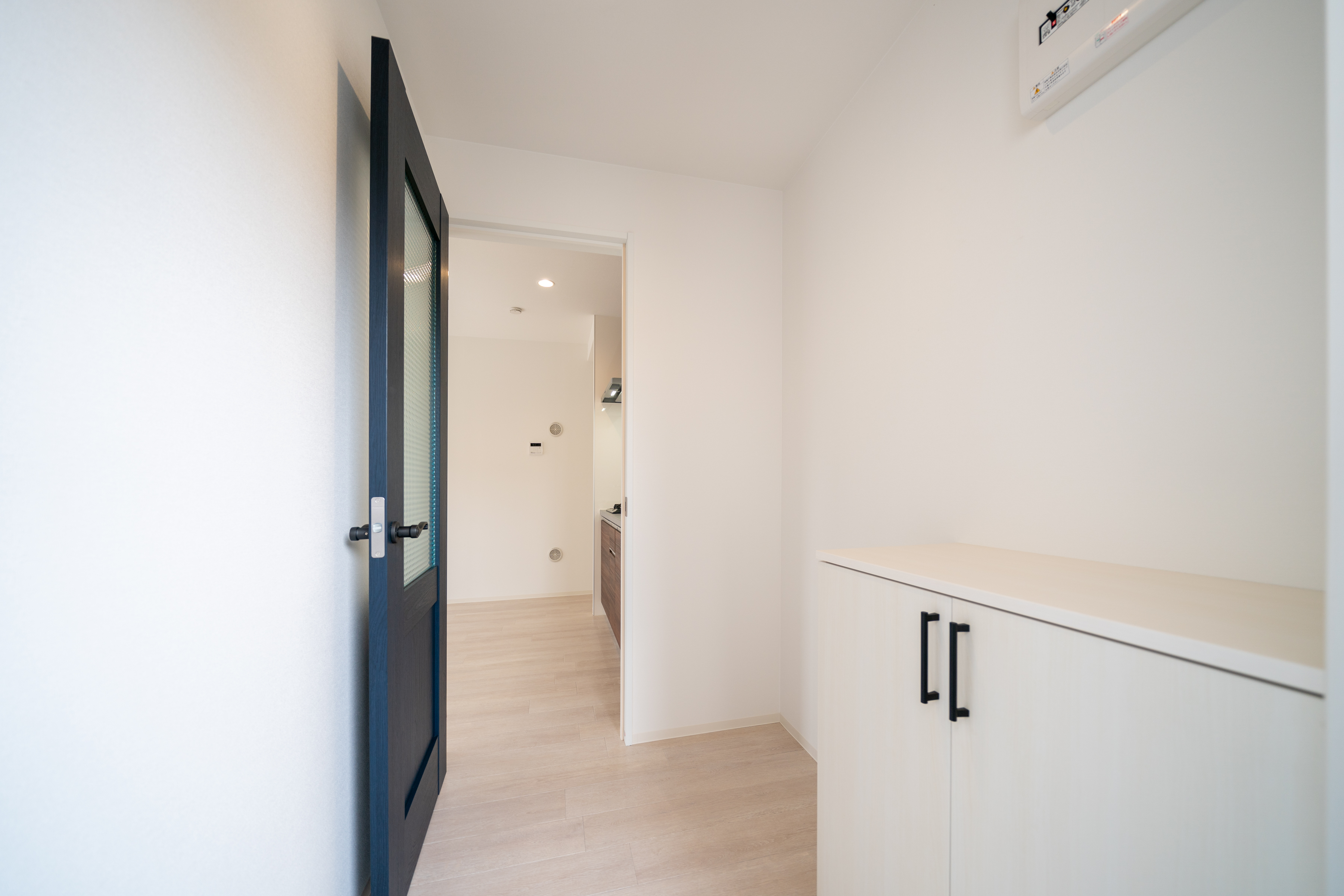 玄関を入ってすぐに見える クラシックブルーのドアが 住む人を迎えます
