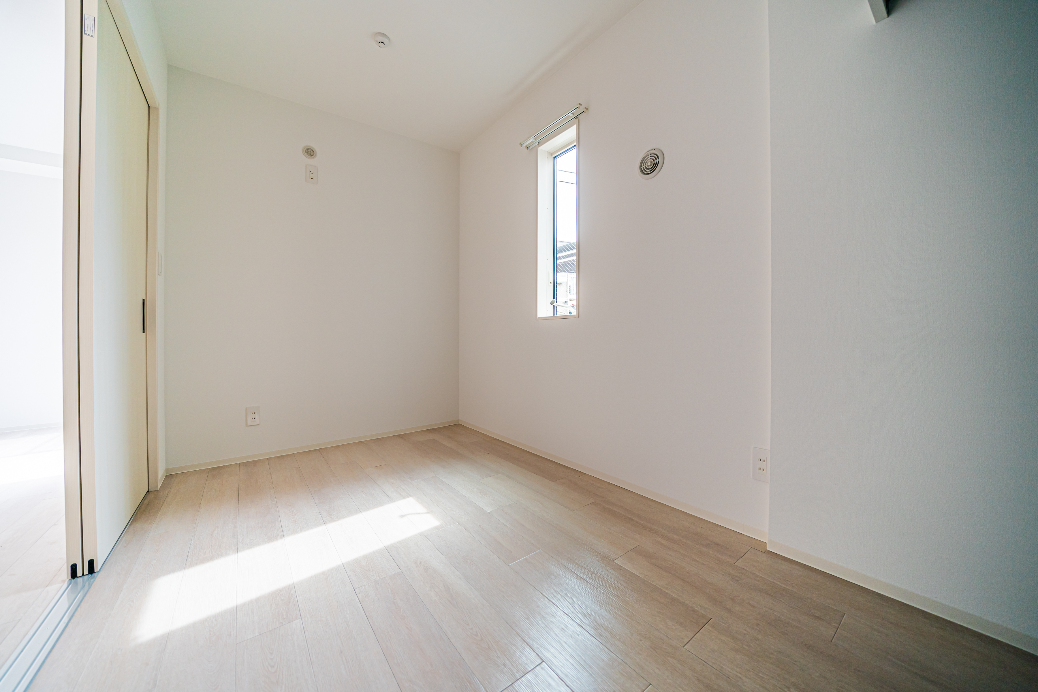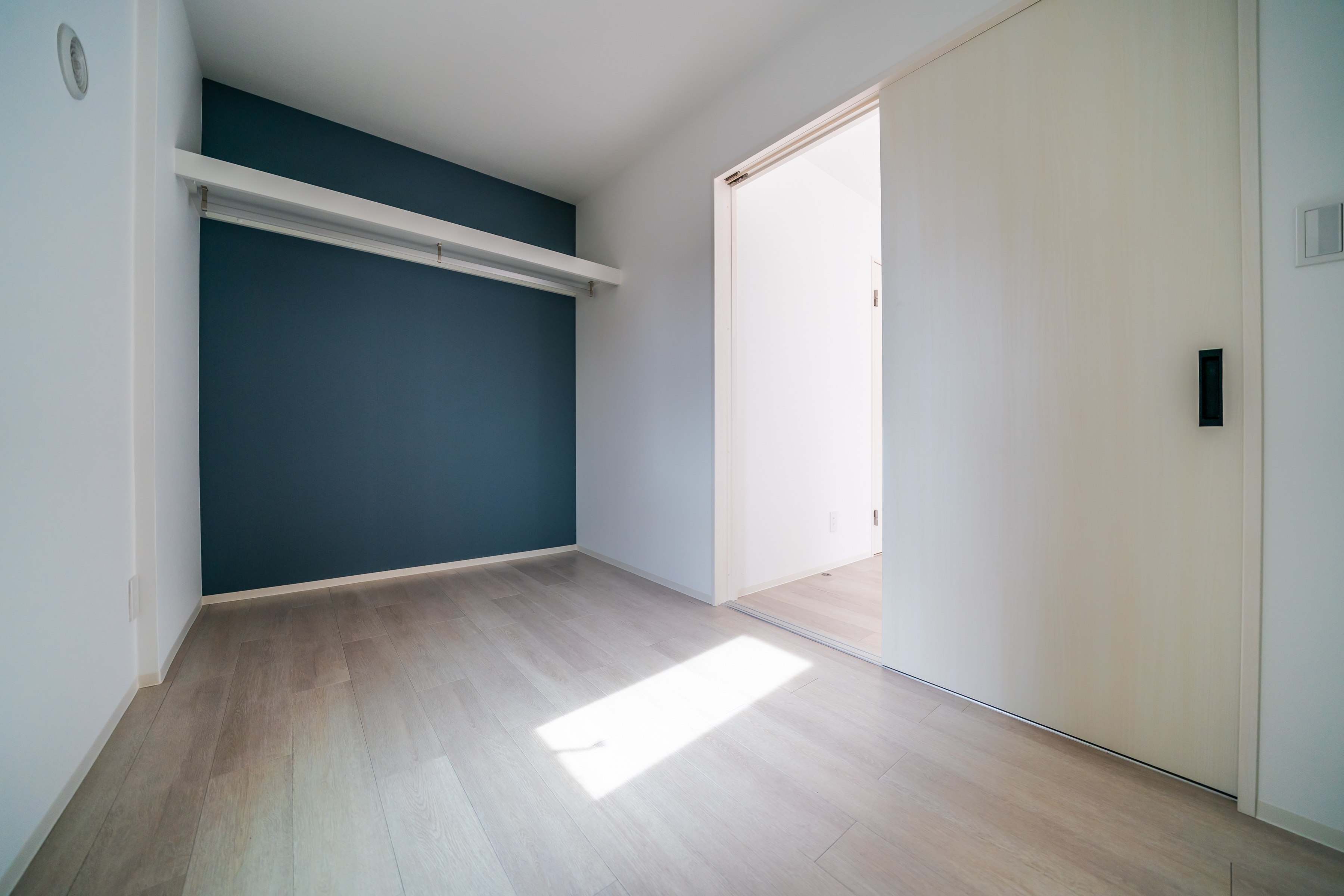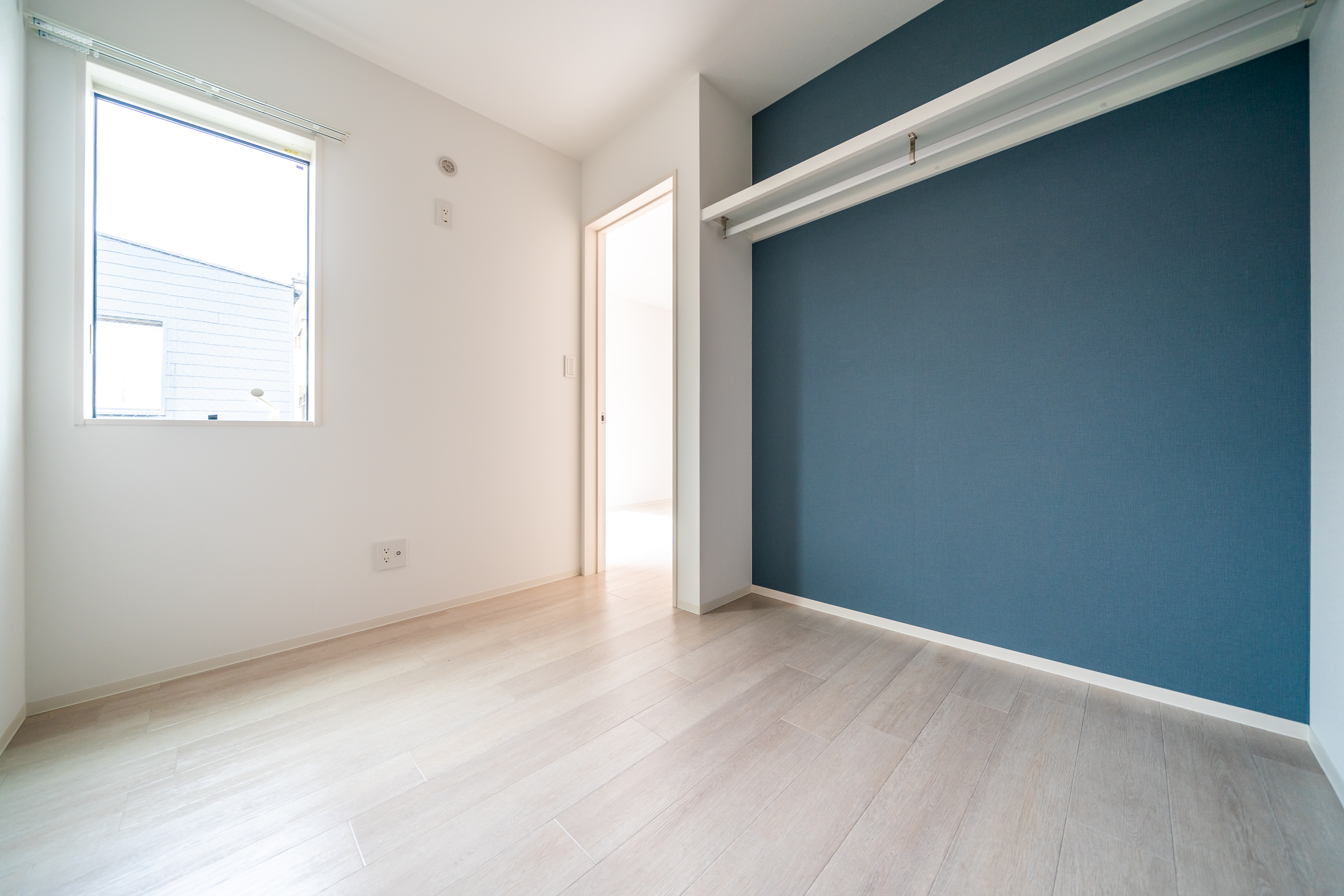 寝室には落ち着きが感じられる ブルーのアクセントクロス