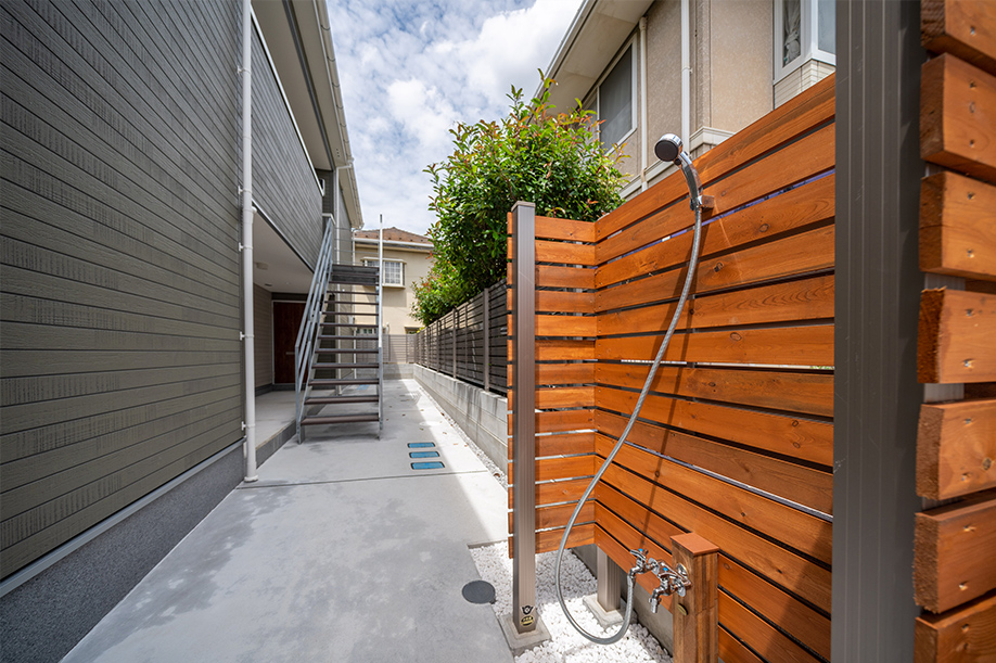 シャワーを浴びてるときに サーフボードを立てかけられる ラックをシャワーブース横に設置