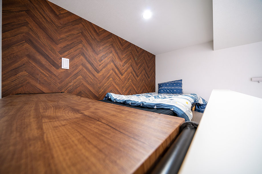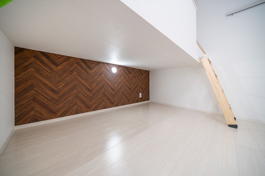 濃い木目のアクセントクロスを貼り
