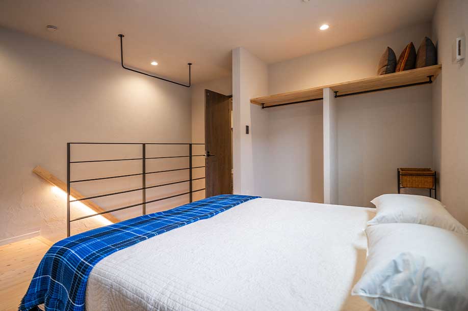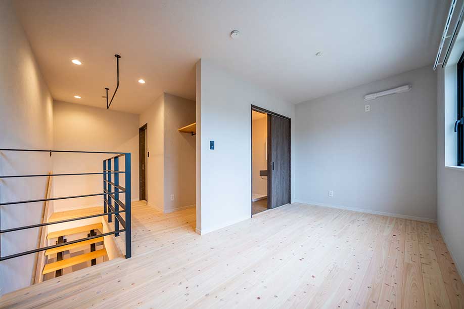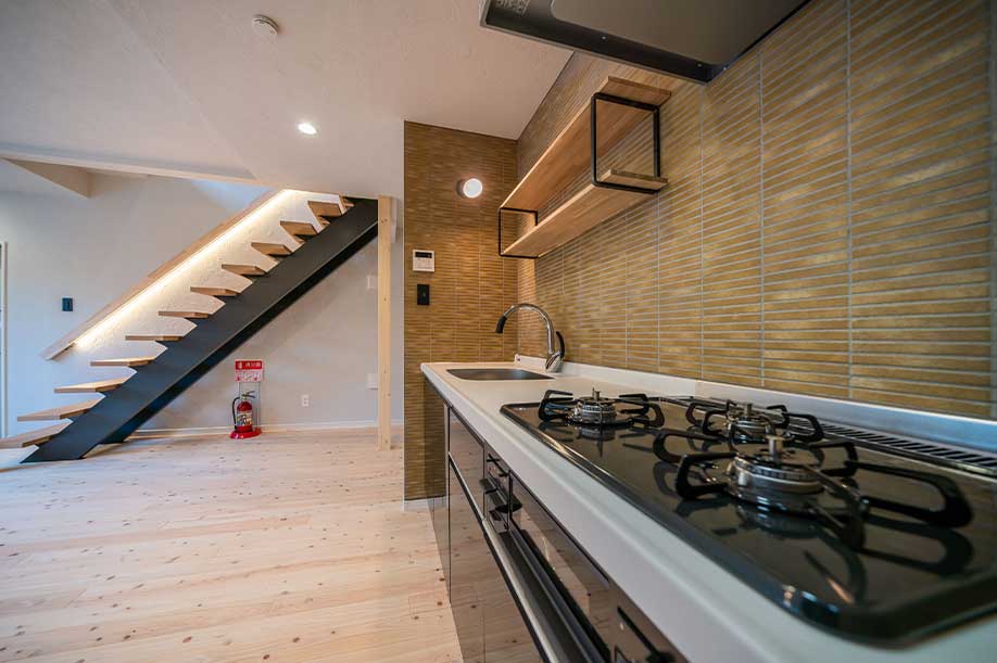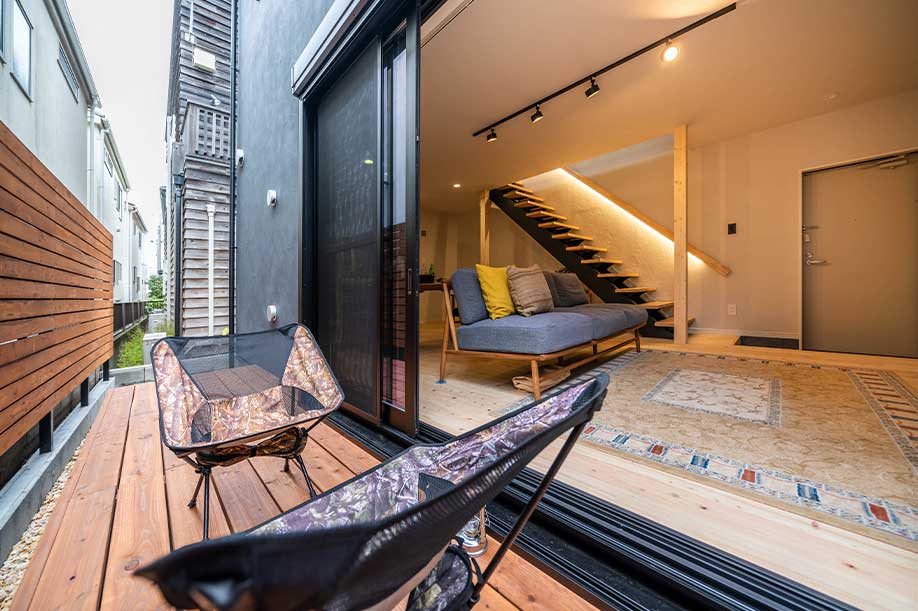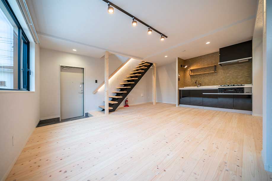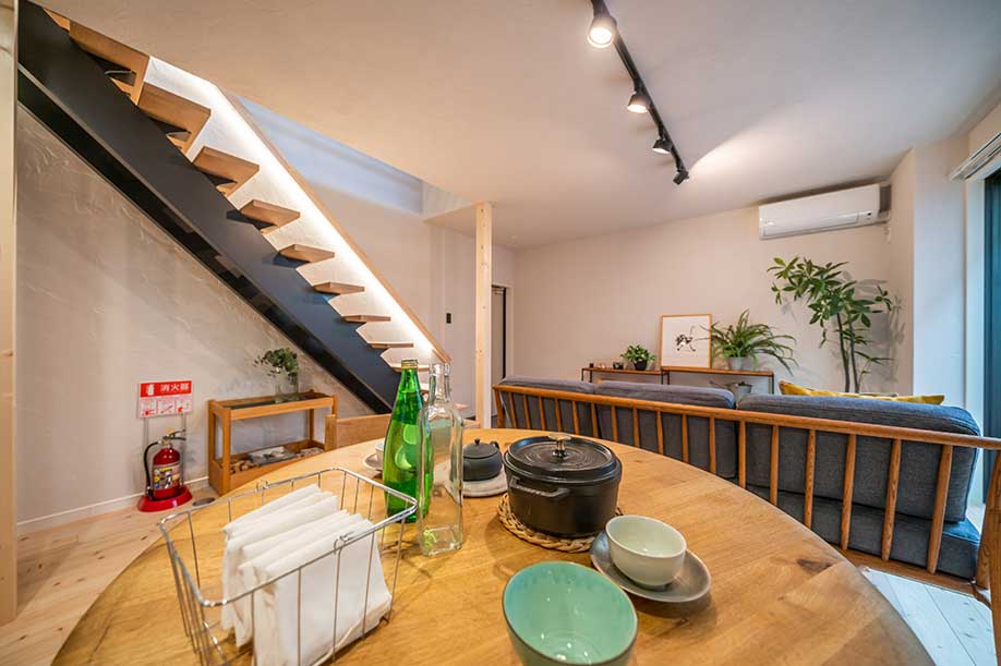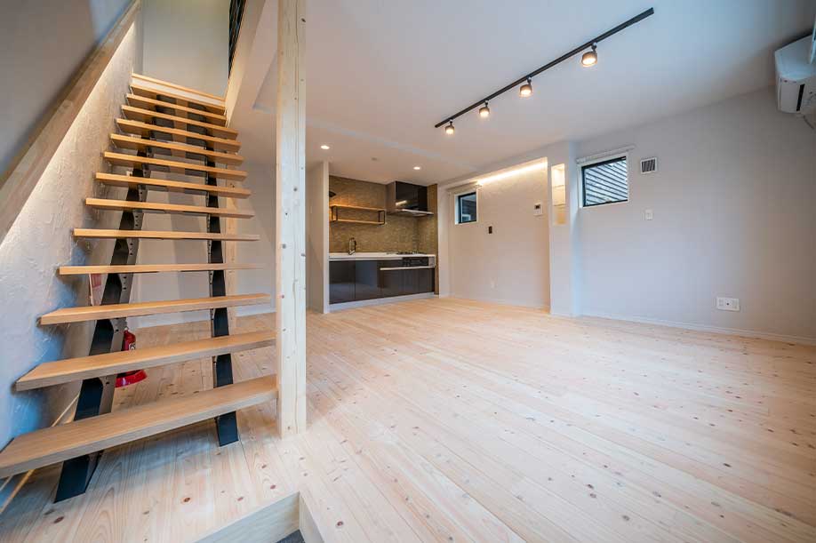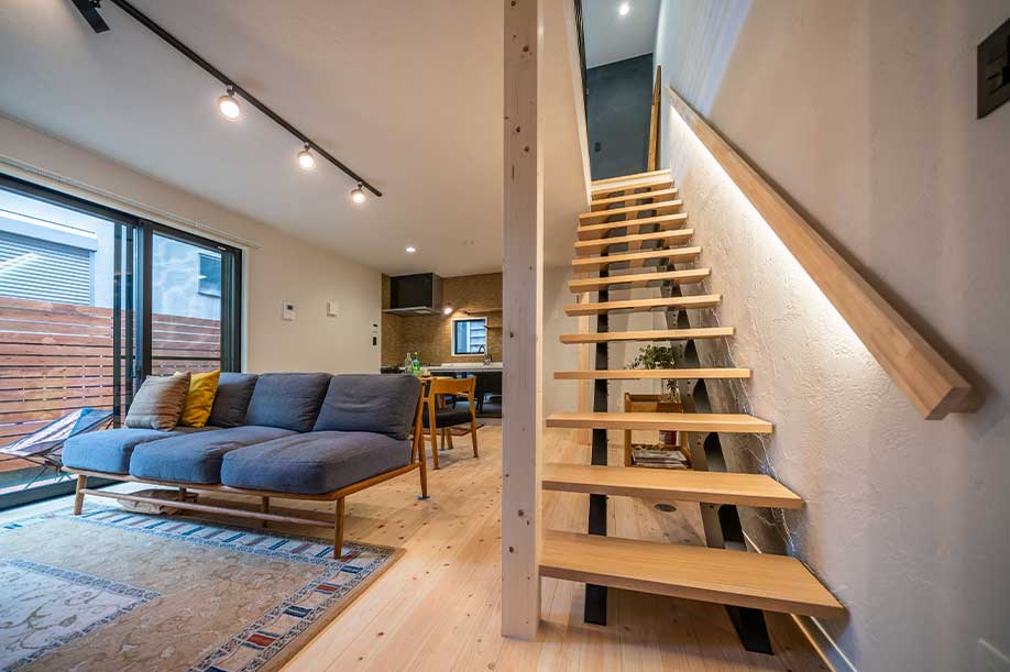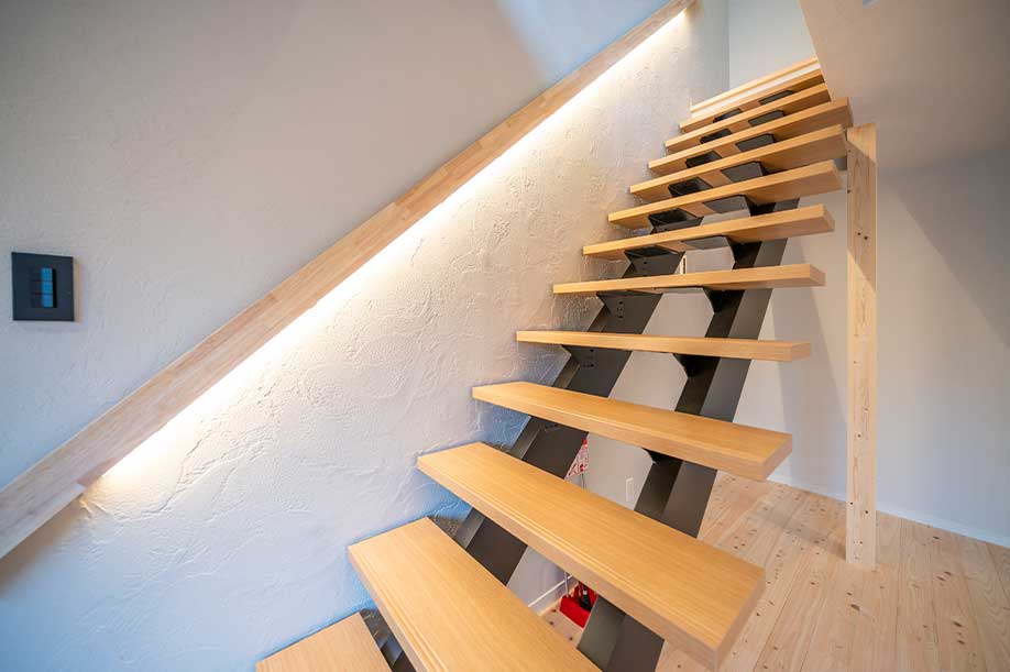 階段には間接照明を設置 リビングを優しく照らし 落ち着いた時間が過ごせます